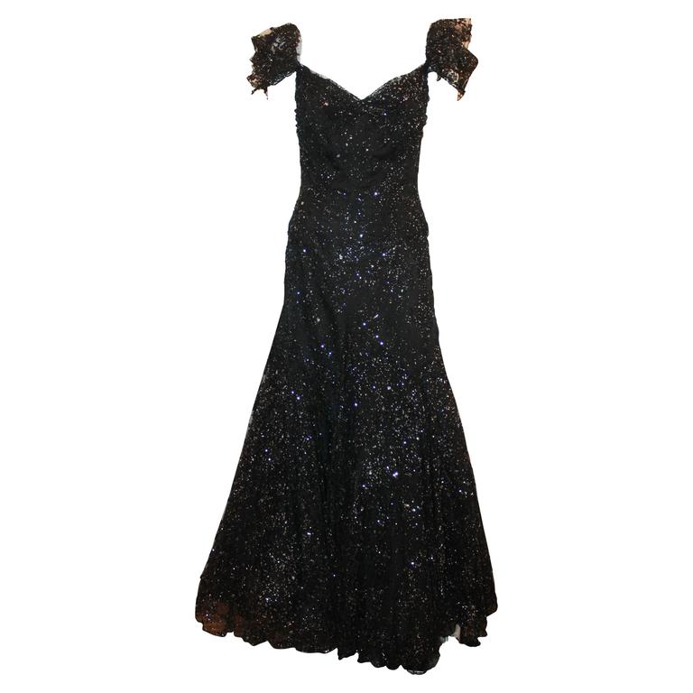 Vicky Tiel Black And Silver Tulle Lace Off The Shoulder Gown 42 For Sale At 1stdibs