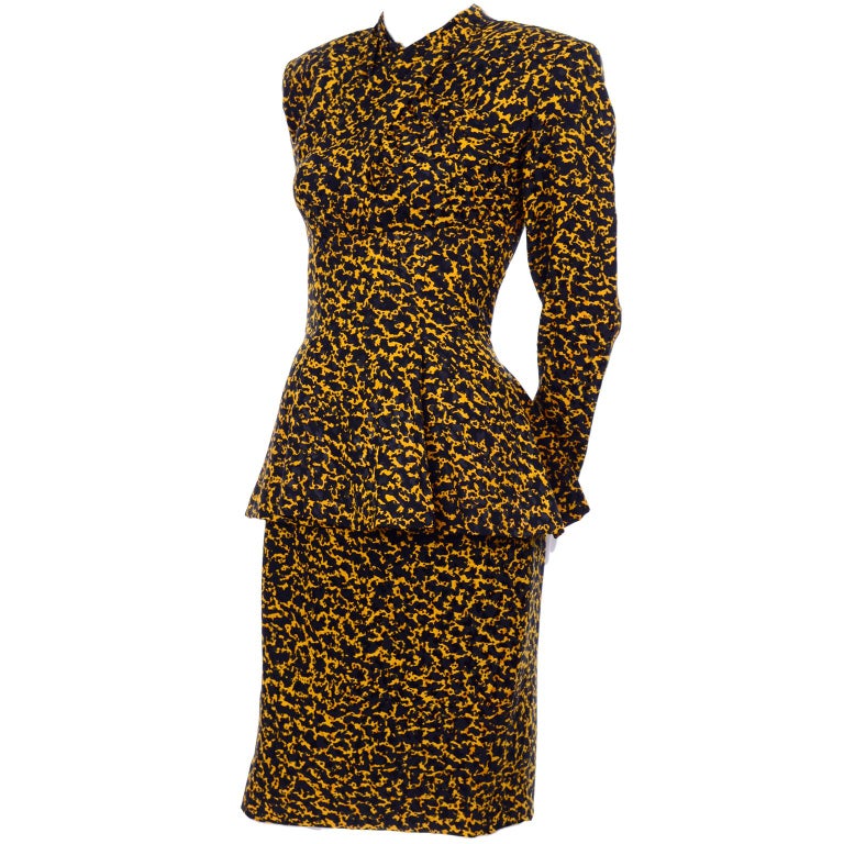 Vicky Tiel Peplum Top And Skirt Dress Suit In Yellow And Black Abstract Silk Print For Sale At 1stdibs